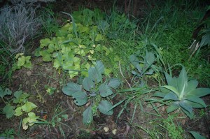 The picture above shows the types of plants that are making their presence known in the garden. There is sweet potato vine from cuttings and also from the ends of tubers started in the kitchen. Agave from a friends garden which will probably be moved into a pot once it grows a little more. Barley and wheat grasses. Cabbages and carrot tops that were from organic carrots from our local farmers market.