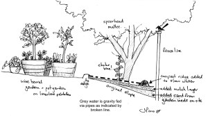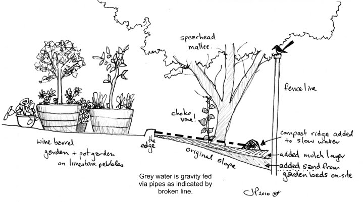 I have had to amend the grey water system because there was still a lot of run-off from the first design and I wanted to catch this water to use. I have since added two more barrels to catch this water. These are connected with tapped hoses which I can either use to fill a watering can or run straight into the garden. I have been experimenting with a soaker hose and tapping the water into a soaker hose in the back garden. I now realize that I really should look at creating some swales. For several reasons. Firstly to make the most of the water I am putting into the garden. Also to create a soil stabilizer along the back fence to assist with the upkeep of the fence. The garden on the other side is slightly lower and I don’t wish to have built the garden up too high to put undue pressure on the metal fence.