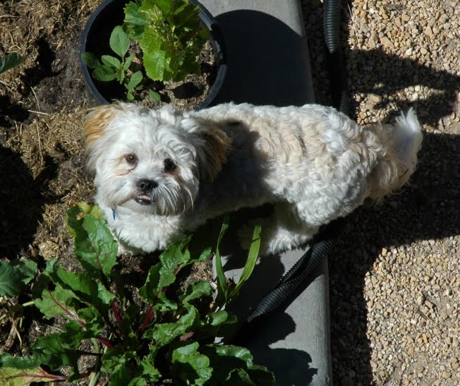 And this is Gizmo just before he wisely decided to withdraw from the garden bed and NOT dig it up this time – since the camera was out.