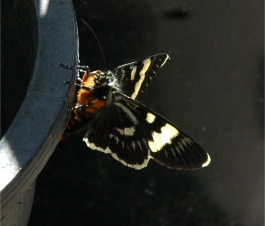These I am not so fond of. Past experience has proven to me these somewhat pretty looking butterflies/moths like to leave eggs on grapevines that hatch into creepy looking caterpillars than can decimate a vine if not kept in check. I shall have to have a good inspection of the garden in a couple of days.