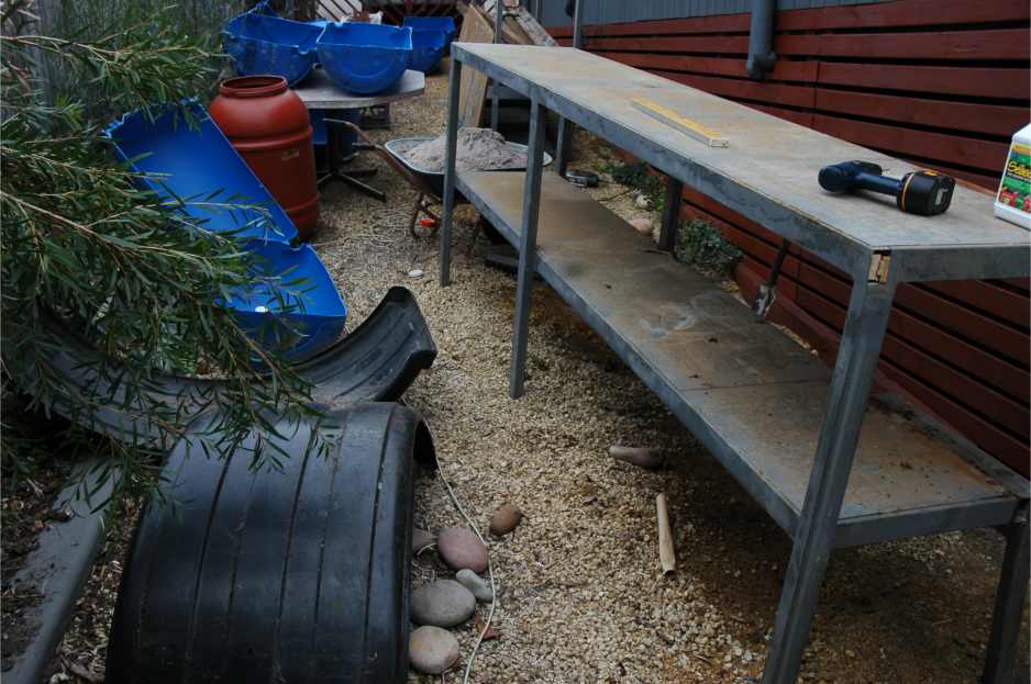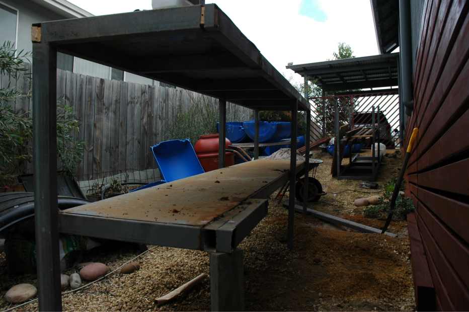 Here is the chaos surrounding the next stage of the aquaponics project. So far, despite some time spent thinking things over, the project seems to be ‘building itself’. The benches I got some months back have worked out perfect for the job. At the time I hadn’t even thought about using them for this project but they are solid enough and have the second shelf all ready for putting the marron tanks and worm farms on.