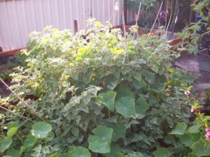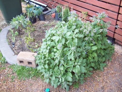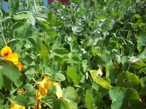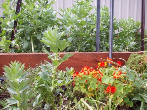 The bed near the chook pen has garlic and sweet peas with a healthy cover of nasturtiums at the moment which is sheltering it all and keeping some of the peas supported. In time this will be removed and added to the compost. It is also camouflaging the other crop of broad beans from the wandering eye of the guinea pigs who have still not found it or been able to reach it. This is a good thing as you can see from the other crop of broad beans near the borage plants that they got into when the barricades fell in windy weather.