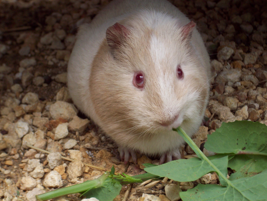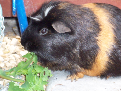 We received Maiki and Jaz after responding to a free-cycle post for a slow cooker. They were also on offer and we weren’t sure what to make of the combination of a free slow cooker and two guinea pigs. Still, my wife brought them home. We really didn’t have any idea just how sick they were. We treated their mange and let them wander the yard and they totally rejuvenated themselves. At first we really thought they were old and on their way out – which is why they were free – but they became so much more active and playful and calmer once the mange was treated and they got good food and exercise. Now their coats are much nicer too. This is Maiki.