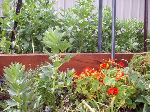 More of the Hedge Garden with nasturtiums, broad beans that the guinea pigs have permission to eat, bulb flowers, coastal daisy, rosemary, marigold, allysum and fennel to name a few. Behind the garden bed wall is the main bed that will function as a vegetable garden with corn, tomatoes, potatoes and whatever else I fancy. At the moment there is purple broccoli and a metre or so of sunflowers to feed the chickens and create some privacy for the back neighbours.