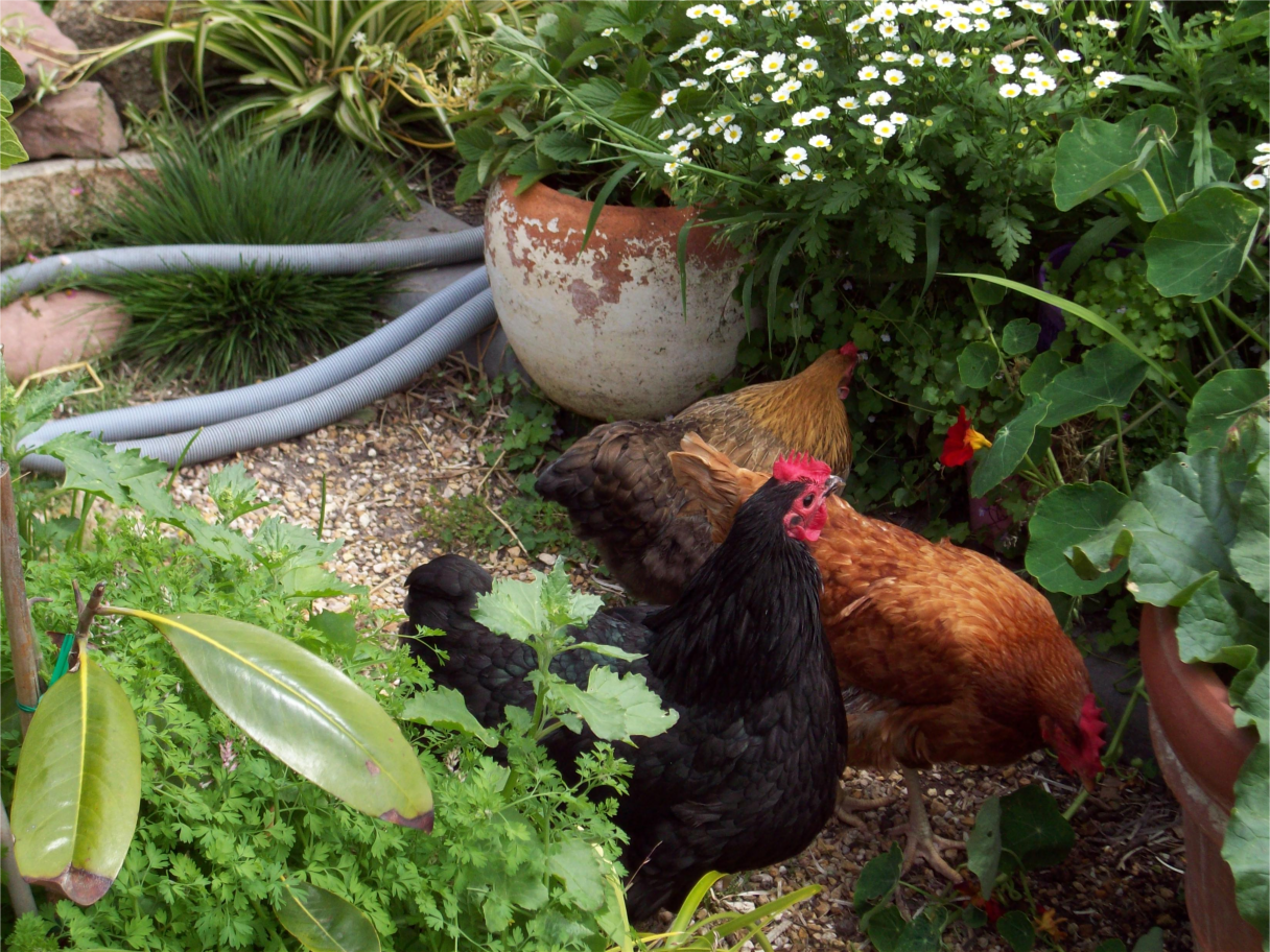 Here the chickens are foraging at the edge of the Hedge Garden that borders the main garden bed recently built. This area is mainly herbs and bee attracting flowers. The Cape Gooseberry is taking up a substantial part of it at the moment and may later get moved, or cuttings moved to the corner garden and the main bush trimmed back. The guinea pigs like to forage along this border as well and given they largely eat their greens from the garden (they are totally free-range) they need to be able to access little areas for food without interfering too much with any crops – like broad beans!
