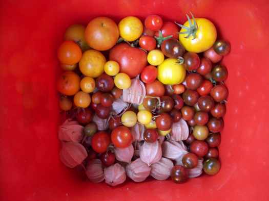 Despite the dryness and the winding down of things in the garden for the re-vamp, there are pockets of plants that are still producing well. Tomatoes being one of the crops. I am storing them in various ways this year. Some are being frozen whole. Others cut and packed into containers and frozen. Others bottled for storage in the cupboard.