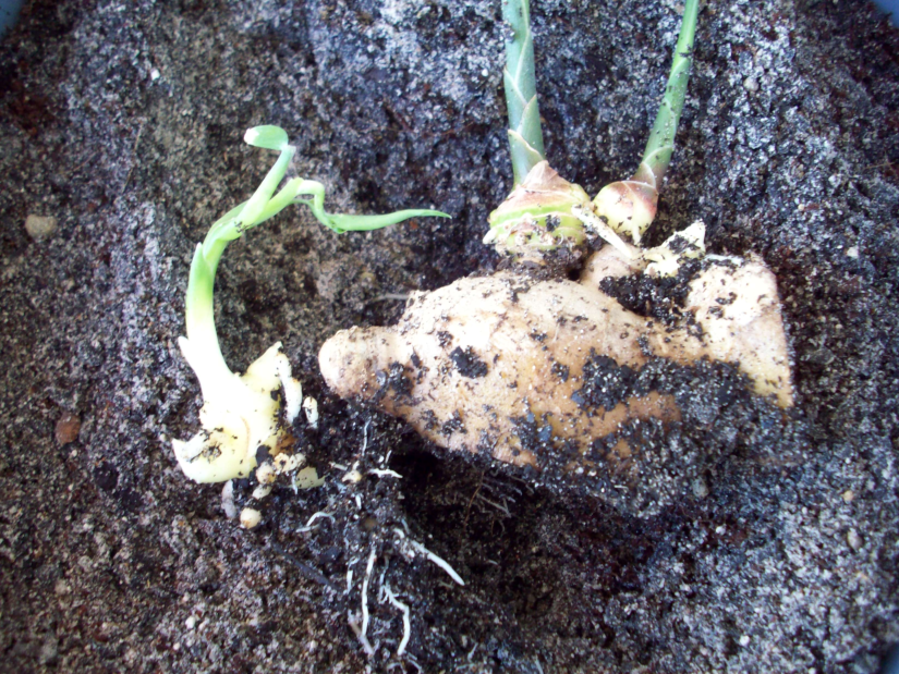 The Tumeric & Ginger that I began to grow about 3 months ago were doing so well I had to re-pot them. I was surprised to find that the ginger rhizome had swollen considerably and had become almost green again as opposed to shriveling away.