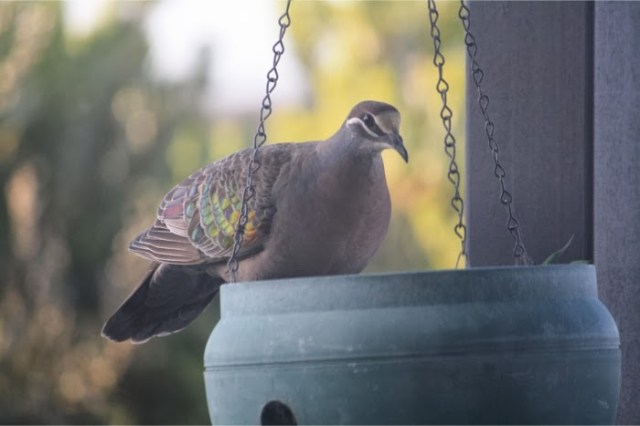 A Bronze-wing Pigeon arrives of an afternoon to search for seeds.