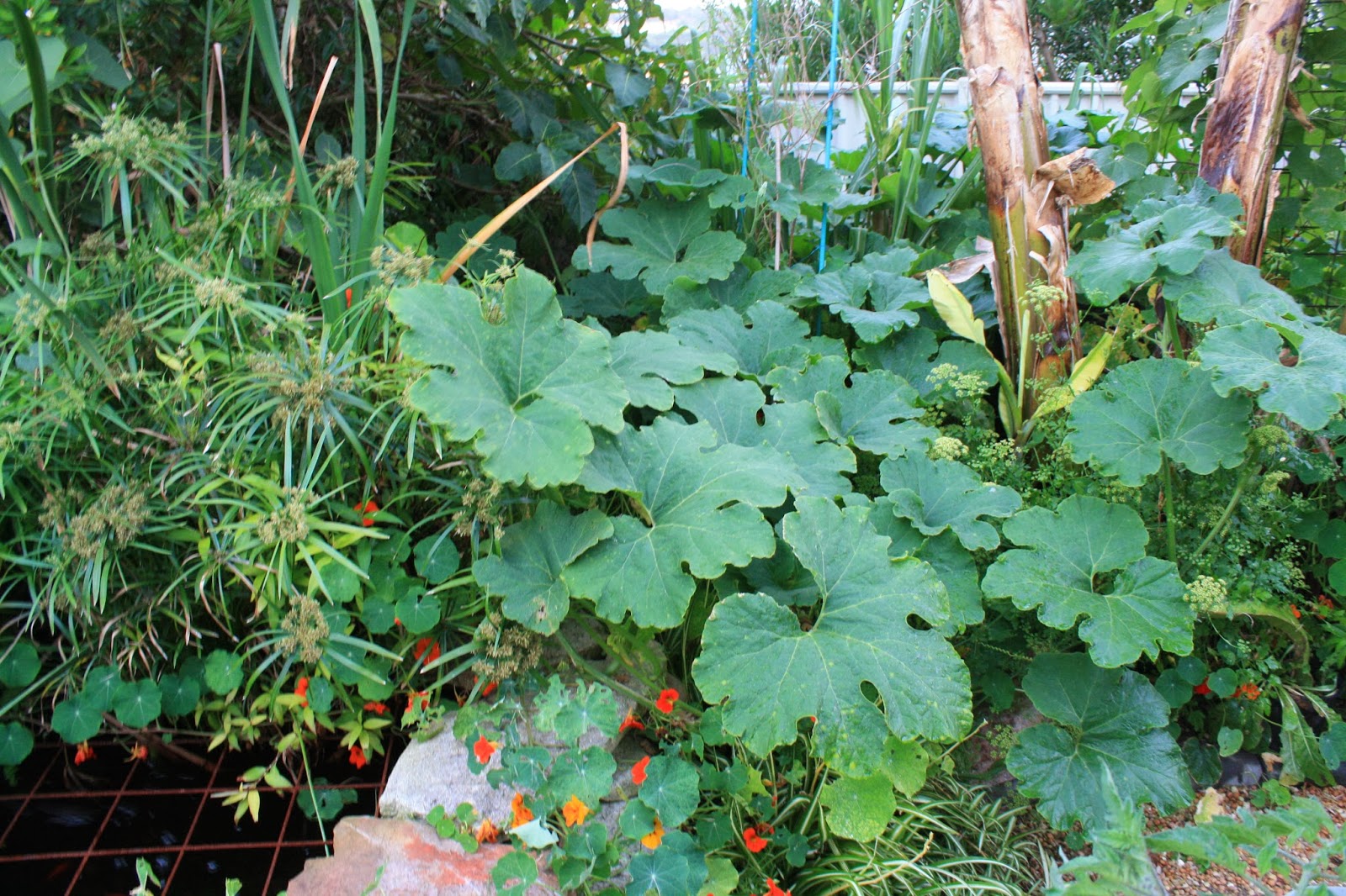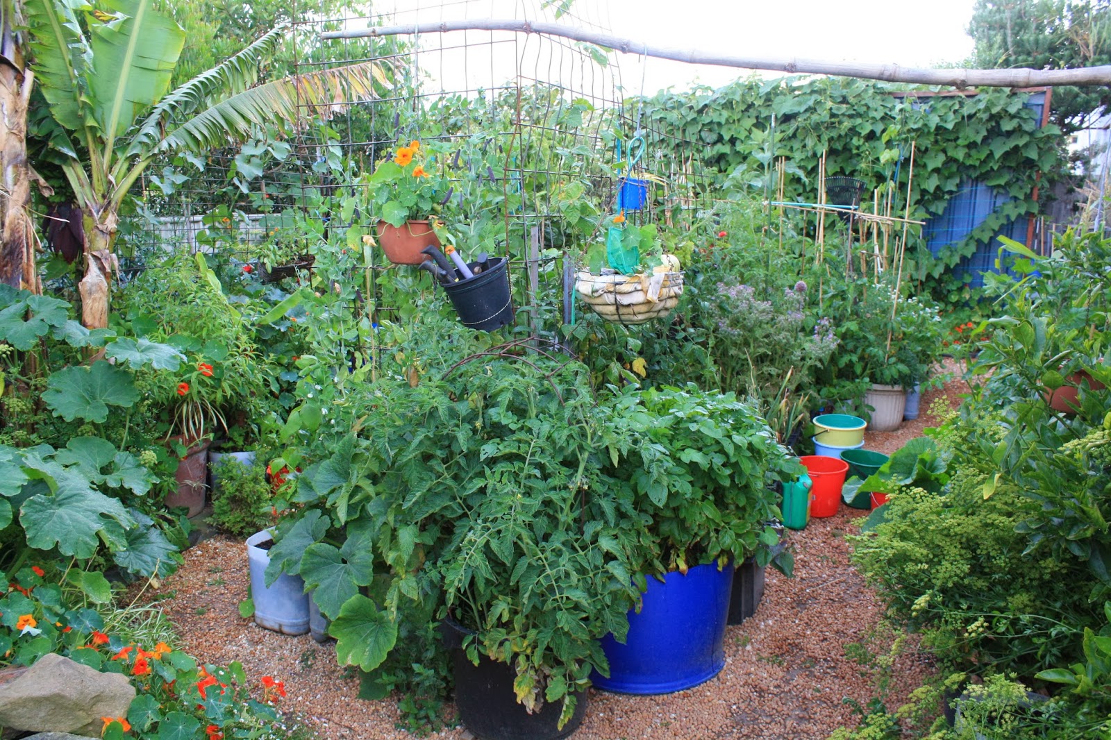 | The last week the garden has had a huge growth spurt. Note the buckets for capturing the grey water. |