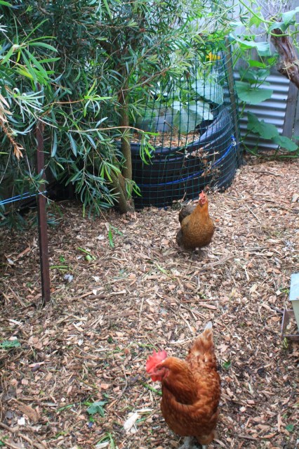 | The new look chook yard with a large compost pile and Blue Banana Pumpkin. |