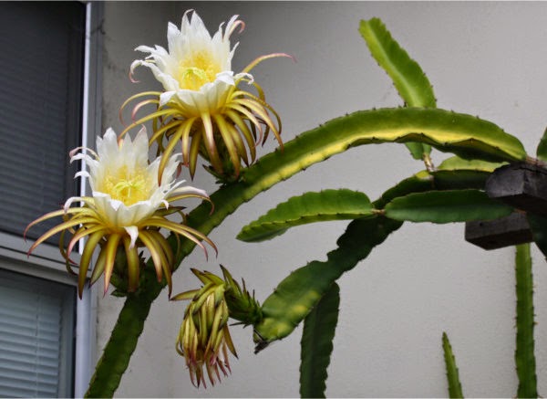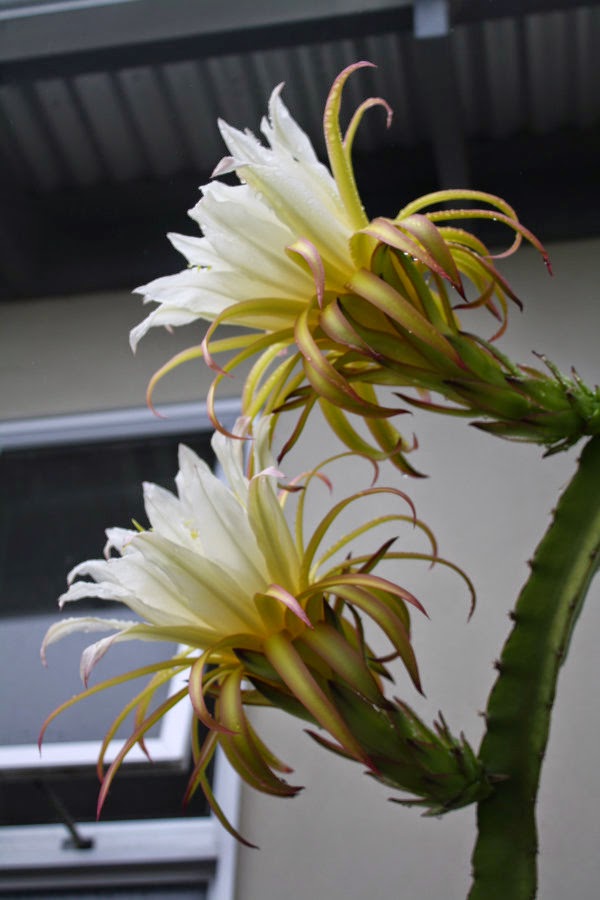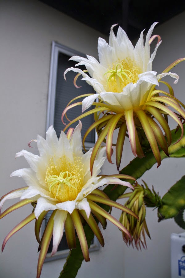 We had a really mild, barmy night on Tuesday night which was followed by an overcast early morning with slight drizzle. I suspected that the pitaya would have opened flowers overnight, but I was not up for the astonishing sight as I came out of the house to find these two wonderful flowers in full bloom and at eye level to me.