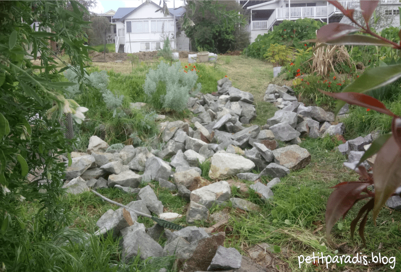 In order to plant out more trees on the top of the block I also spent about two days moving rocks from the pile that was dumped there during the renovation. It was incredibly deceptive how many rocks were in that pile. I have more than enough to put towards some future projects. More than I ever thought there would be.