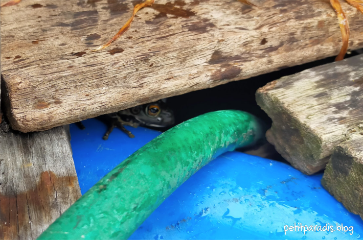 Bullfrog did not appear amused with any of the changes in the garden. After having to shut down the greywater system for a day or two the water level was getting low. I got to it today and gave the system a well-earned maintenance session. Flushing it out and stripping back some of the slime that inevitably builds up in the main system.