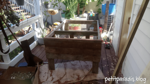 I’ve nearly finished the rabbit hutch with a worm farm underneath to catch droppings and food scraps. I moved the old guinea pig hutch that was claimed by Little Fella No. 1 as a potting bench – and on further inspection decided to patch and mend rather than dismantle. So I worked on that also.