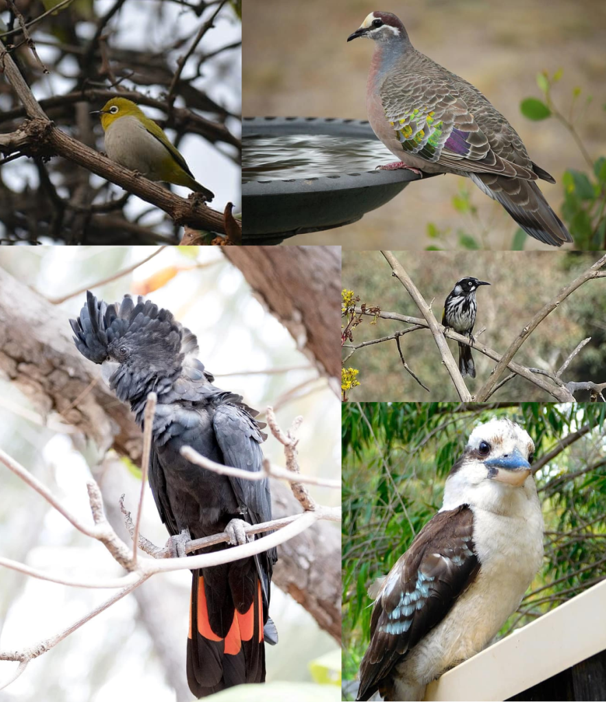 Kookaburras could be heard up the slope, as could Red-tailed Black Cockatoos which also flew over during the morning. Silvereyes fed on grubs in the tomato bushes and Purple-crowned Lorikeets flew furtively, high, high up in the sky, seeking flowering gums.