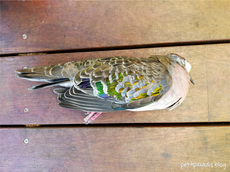 The Bronzewing sat in the shade, unperturbed. Before I went into the house to clean some parsnip I checked on it and talked to it. It kept its eyes closed and didn’t open them when I spoke softly to it. Very unusual. Like it was in a deep meditation.