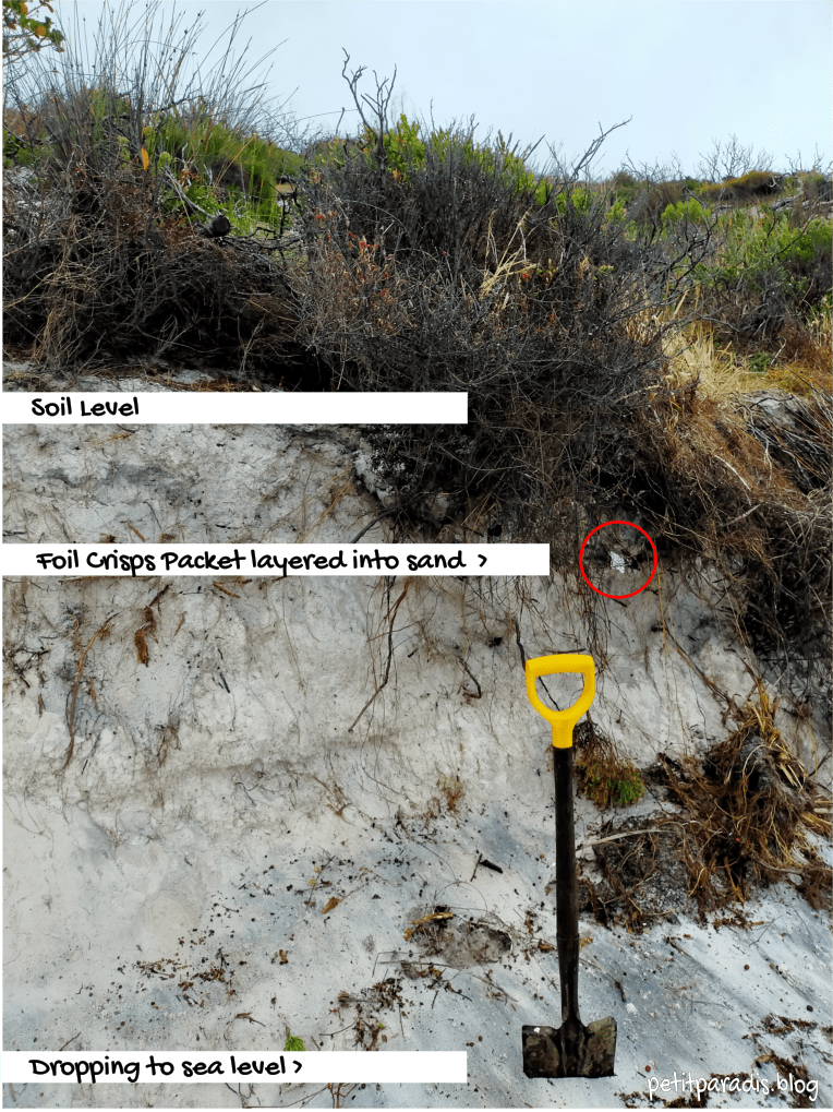 From the edge of the surf this wrapper was probably 2 metres up and a half a metre under the surface of the soil. The mind boggles.
