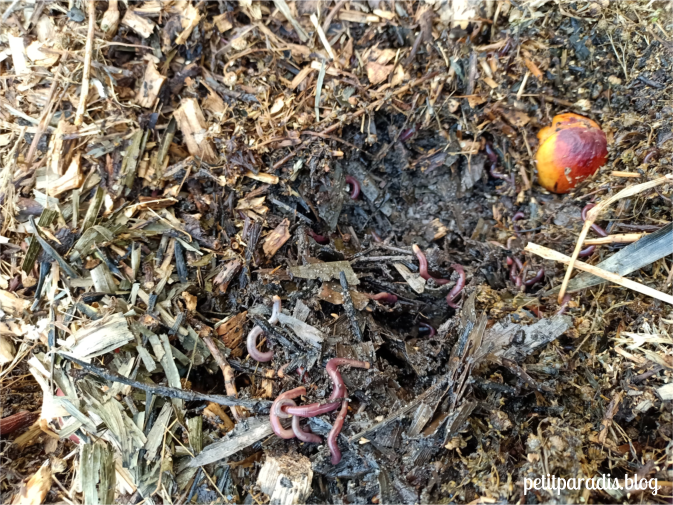 The organic matter right under the surface of this mulch pile is damp and full of worm activity.