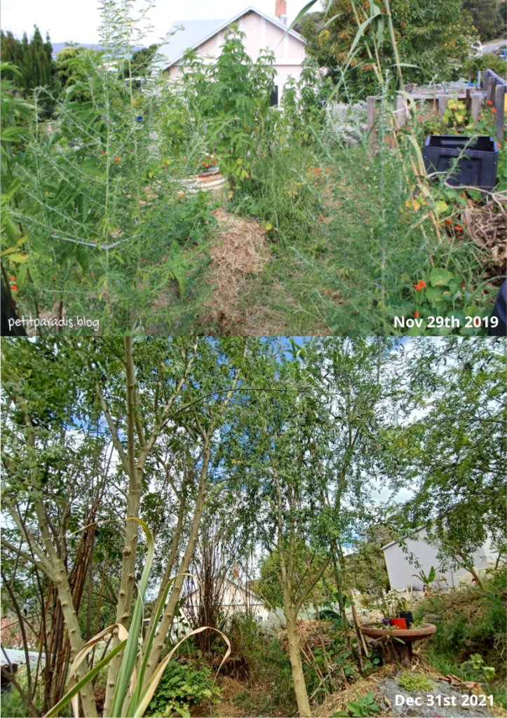 With exceptional rainfall right throughout the year, both lots of tagasaste probably also benefited from the extra water in the swales as the overflow from the rain tanks emptied into them.